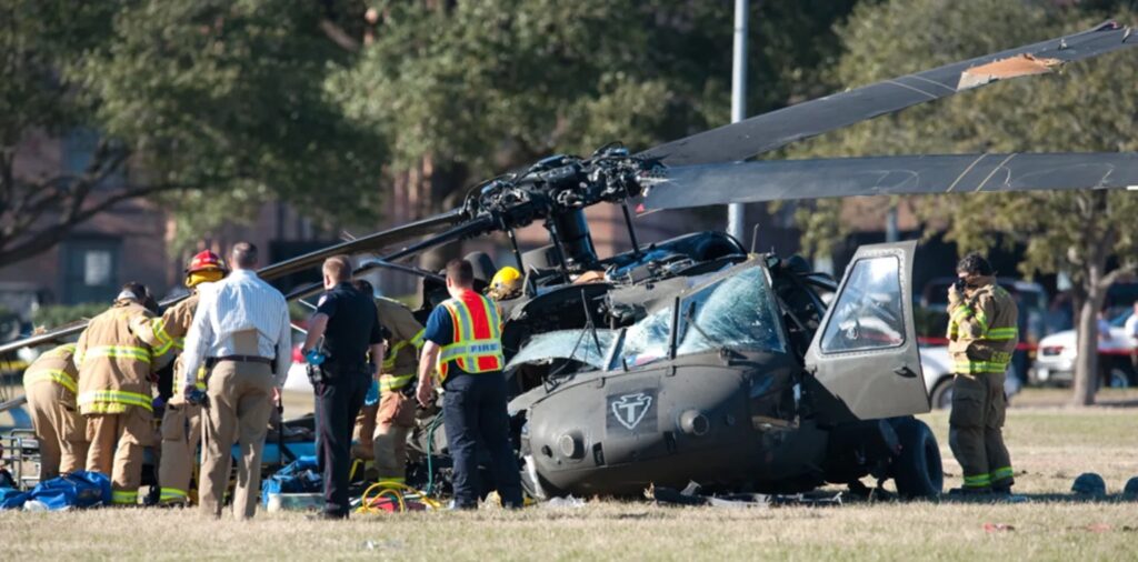 The UH-60 Black Hawk was carrying a crew of five — four members of the Army National Guard and one member of the ROTC staff at Texas A&M who is a recent graduate, the school said. The helicopter was taking off when it fell abruptly back to the ground on Duncan Field, an open field adjacent to Duncan Dining Hall.