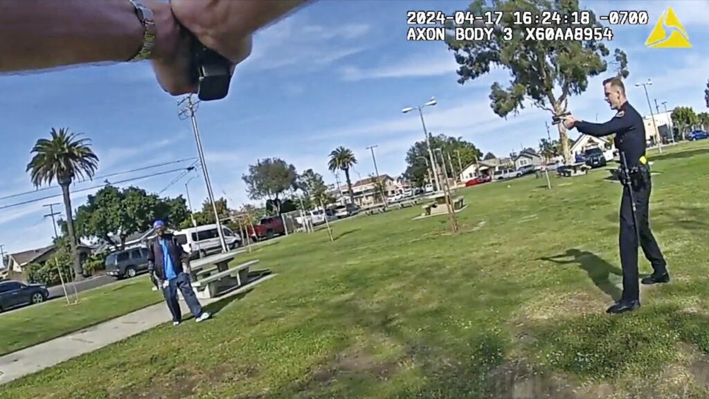 An armed man, who had a gun in his jacket pocket and was slowly backing away from Long Beach officers at MacArthur Park, pulled out the weapon and briefly extended it outward away from his side before bringing it down when he was shot twice by one of the officers, body-worn camera footage released Friday by the Long Beach Police Department shows.